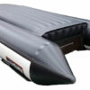 Надувное дно лодки Хантер 335 А Лайт – имеет безкилевую геометрию, это максимально повысило остойчивость лодки в «статике», что в свою очередь позволило человеку спокойно стоять на надувном дне НДНД. Это по достоинству оценят любители спиннинга, которые любят ловить стоя в заброс. Надувное дно крепится к баллонам широкой полосой с двойным контуром, что придает конструкции необходимую жесткость. Само дно НДНД представляет собой замкнутый и независимый герметичный отсек. С внешней стороны надувного дна. установлена специальная жесткая пластина, так называемый «интерцептор», он существенно облегчает выход на глиссирование, и управление лодкой. Конструкция, надувного дна имеет необходимую жесткость и обеспечивает лодке высокие скоростные характеристики, позволяя выходить на глиссирование даже под маломощным мотором.